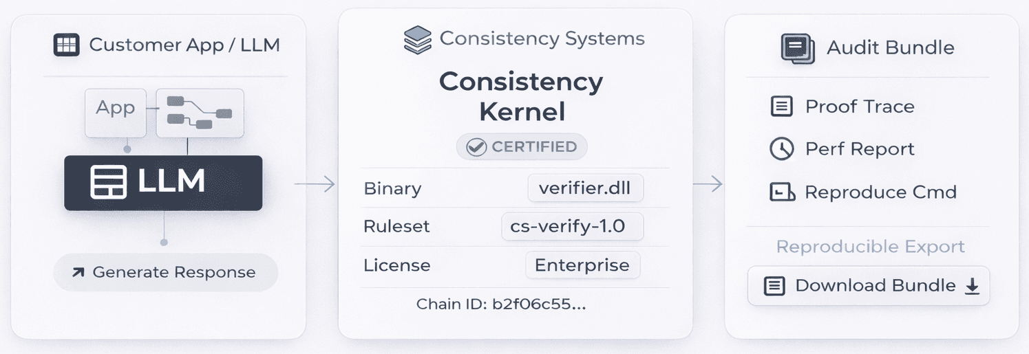 Delivered as a hosted certification API that runs in-path at inference time — no model retraining or architectural changes required.